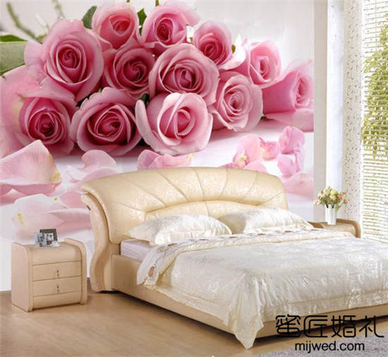 1、婚房面积:选择婚房壁纸要先考虑婚房面积,如果婚房面积比较大,就不适合选用暖色大花的壁纸,这样会房间空间会有缩小的感觉,如果选用素雅的小花墙纸则可以拓展房间的视觉空间;