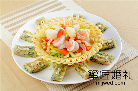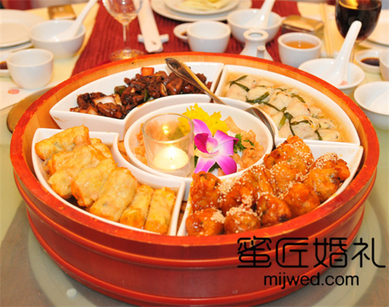 3.婚宴菜的命名要尽量选用吉祥用语以寄托对新人美好的祝愿,从心理上愉悦宾客,烘托气氛。比如:珍珠双虾一般可以取命为比翼双飞,奶汤鱼圆一般可以取名为鱼水相依,红枣桂圆莲子花生羹一般可以取名为早生贵子。