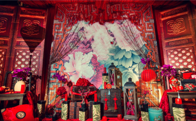 3.新娘家提前准备好红枣、花生、栗子(寓意早生子)用红绳穿两串,放在一个红色带喜字的盆内。另准备用红绳捆好的宽心面两把、红筷子两双,放在另一个红色带喜字的盆内。这两个盆分别用红包袱包好,待新郎新娘出门时交给伴郎携带到新郎家中备用。