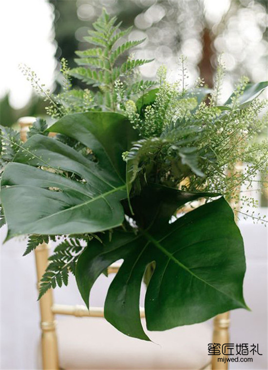 五、座椅:座签可以用绿叶装饰,也可以是一份小型的绿植,让宾客们也能把婚礼上的幸福感带回家里。看惯了花环的千篇一律,用绿植叶片装饰的座椅是不是让人更想坐上去自拍呢?