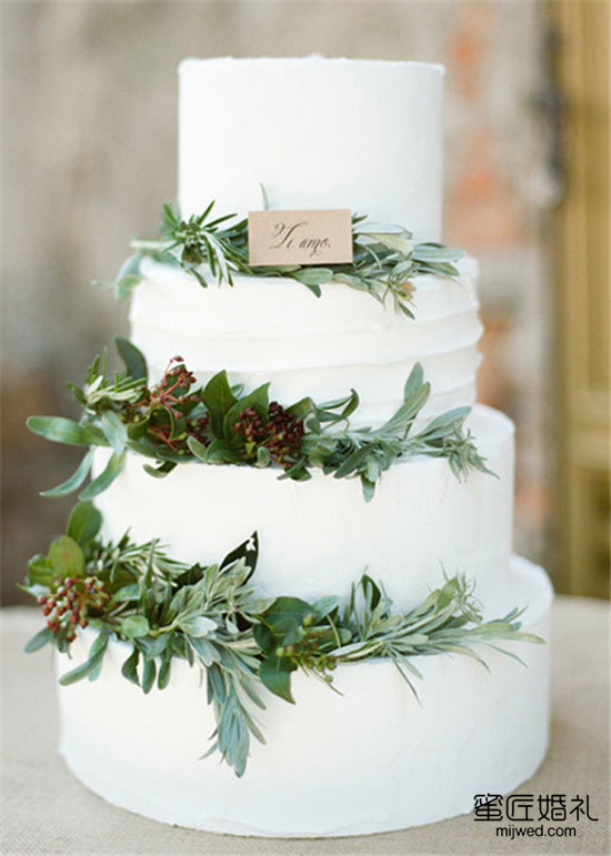 六、婚礼甜品台:吃作为婚礼上绕不开的话题,用心准备婚礼上的蛋糕和甜品,把幸福和甜蜜分享出去。极简风格的白色奶油蛋糕或者朴素的裸蛋糕,用新鲜的绿叶去装饰,象征了新人纯净的爱,充满了对未来的希望。