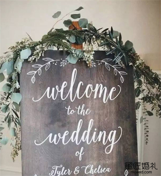 二、婚礼指示牌:迎宾牌的装饰同样不要忽视,把尤加利叶挂在文艺感十足的黑板或画板上,活泼不拘谨,给婚礼增加轻松的细节。