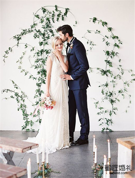三、仪式区:而到了婚礼上较受瞩目的仪式区,整整一面墙的绿植展现出“野蛮生长”的架势,就像爱一样茂盛,绽放出生命独特的美感。当然,准备一个绿植装饰的花门会让仪式区看起来显得成熟和正式,大片的龟背竹等叶材更容易突出别致的造型。枝条搭配简约的白墙,衬托出一种北欧风格的高级感,简约之中都彰显了新人独特的美学品位。