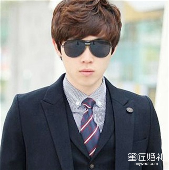 发型给人一种清新爽朗的感觉,而且也比较容易打理。新郎们只需穿戴整齐,立马变身高富帅。