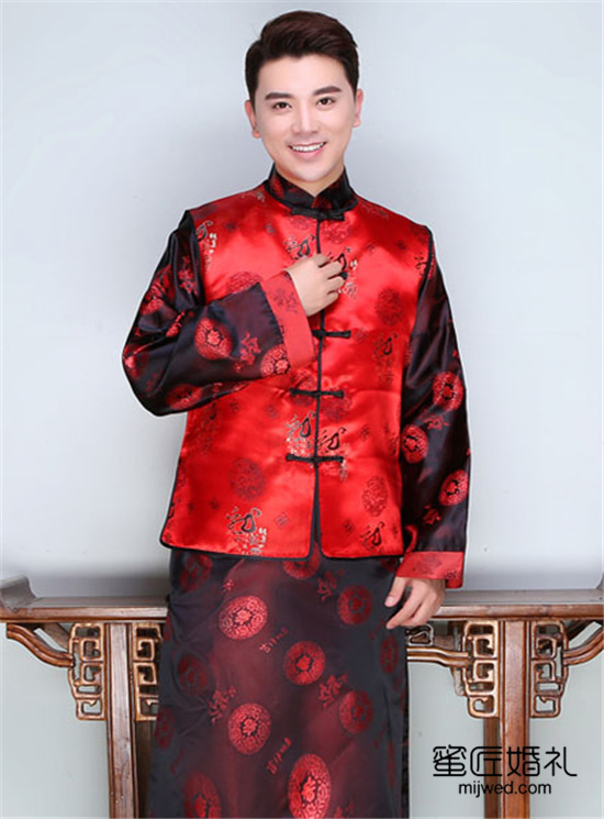唐装也是中式礼服一种,新娘秀禾装新郎穿什么,唐装搭配秀禾服也是毫无违和感。它和秀禾服区别在于交领、右衽、系带、无扣或布扣。以红色和黑色为主色,唐装式立领设计。精美刺绣和手工盘扣。绸缎面料,没有大面积刺绣更加显得东方韵味。