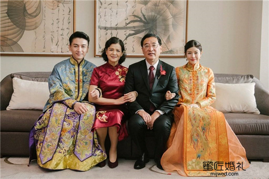 有看到明星婚礼的新人,应该会发现很多男明星也会穿上一套男款的秀禾新郎礼服。像陈晓、张伦硕他们定制秀禾服,都是新娘配套的。寓意花纹都是非常精致。所以新人们在准备中式礼服时候,不妨也选上情侣装的秀禾服。