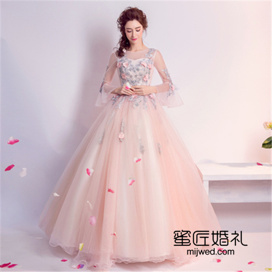 蜜匠婚礼觉得如果准新娘已经在敬酒时候穿了红色敬酒服,我们可以选择少女的粉色。很仙的颜色,很多准新娘也能hold住。面料上可以用轻薄的纱质面料、蕾丝等。立体的花朵加上蕾丝刺绣,还有手工的钉珠再加上袖口自然均匀喇叭状。多了一份仙美。
