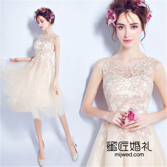 喜欢浅色系的新娘,那么香槟色是不二选择。香槟色迷蒙映现华彩丽姿,浮花剪影轻纱流连的朦胧之美,淡雅柔丽的魅丽色泽。焕发准新娘惊艳!轻俏的短裙摆洋溢着青春的活力味道,秀美出挑的性感美腿。也非常适合浪漫满屋的感觉。