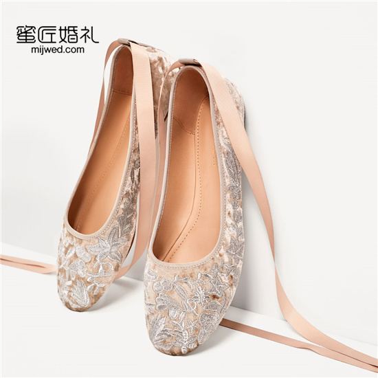 如果是身高有165以上的伴娘,我们完全可以选择好看的平底鞋,既好看一天下来也不会脚疼。zara这款香槟粉的平底鞋,带有灰色的绣花和粉色的绑带真real仙气十足啊。