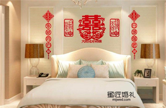 喜欢简洁一点的准新人可以参考下面两张的创意婚房布置效果图。一个是浓浓中式剪纸来布置婚房。非常方便,而且又有特色喜气。婚礼后整理起来也非常方便。所以如果新人们想要简单一点中式风这个就可以满足了。