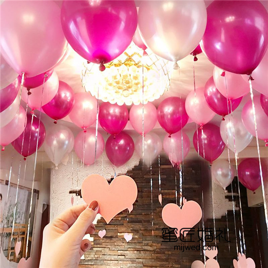 准新人如果想要气球布置婚房,可以尝试一下这种气球下面还吊着爱心的。真是非常唯美呢。除了前期要花费大量人力打气球以外,装饰时候其实非常容易。
