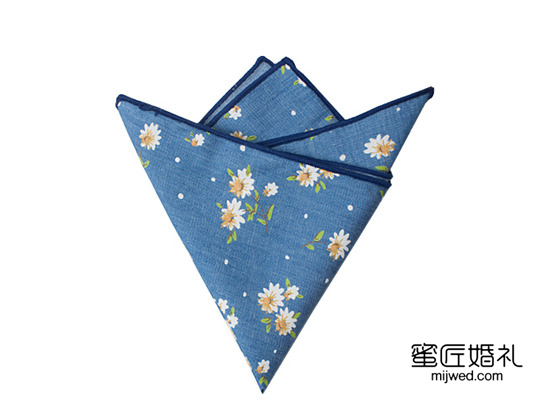 举行户外婚礼和森系我们可以选择清新一点的新郎西服口袋巾款式,像这碎花款口袋巾就非常适合,再带一点田园风个,展现绅士魅力。可以像图片上使用三角折法。如果对于怎么挑选口袋巾颜色没有信心,那么只要记住口袋巾和衬衣保持同色系就可以了。