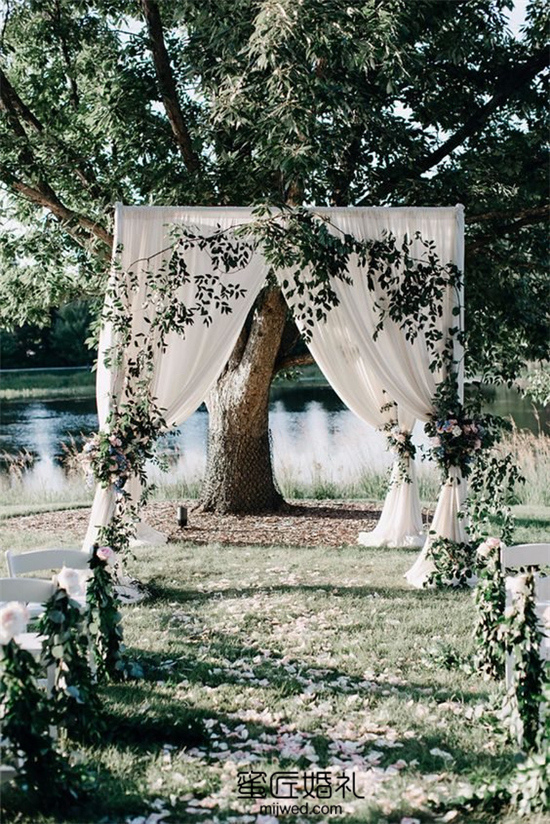 还有这种利用户外婚礼的树木,直接把纱幔挂在上面装饰成拱门。白色和绿色树叶形成羡慕对比,有了大自然天然装饰。新人也不大肆采买物料,又省下了一笔费用。