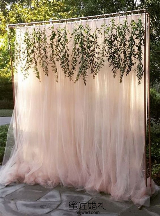 想要布置简单户外婚礼拱门,可以租赁这种铁质的门框。把纱幔挂在上面,这种粉红色就非常适合。在挂着一些树叶与户外景色相融合。可以用来作为背景提供来宾们拍照。
