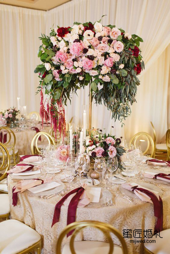 蜜匠婚礼觉得我们应该参考图片上,婚宴布置是香槟金,但是婚宴上的花艺设计采用的是粉色、酒红。和白色。而餐巾和盘子与选择的颜色与之相呼应。可谓非常用心。