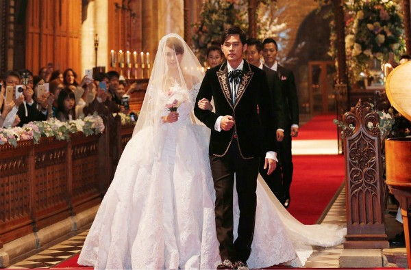 短款婚纱有视觉延伸效果,觉得不够隆重的新娘可以选择前短后长的款式。