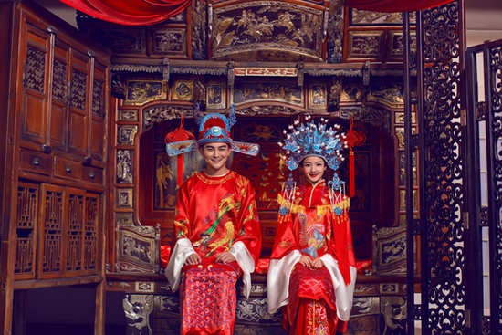 我们都是21世纪的人,在古装婚纱摄影时就如同拍古装戏,你完全可以把自己当成古装戏里的主角,代入到古典场景当中去,想象电视剧里主角的动作姿势,尽量自然的展现出古代人的风韵。如果你想在古装婚纱照中带入性感姿势,可以选择美人鱼式姿势,场景以床上为宜,红纱配红床,再摆放一些花,这样可以把一种朦胧的美展现出来,流露出无限的遐想诱惑。当然较好在后期制作中改下色调,让画面更具古典风。其实喜欢古典风格新人可以举行周制婚礼,也是别有一番特色。