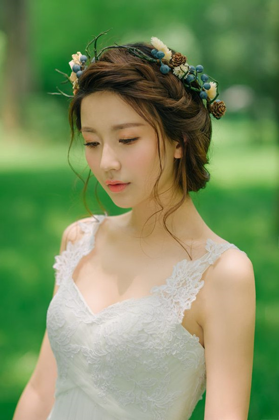 圆形脸的新娘,可以考虑用偏分的刘海突出脸部的纵向线条,露出一小部分额头模糊较低的发迹线。偏分而有层次的发帘能够使脸型看起来修长,较好能与两侧的头发自然衔接,制造出飘逸的下垂感。如果不适合偏分的发型,不妨将发帘修剪得非常短,让宽度略窄,或是剪出倾斜或向上弯曲的弧度。压在眉上的整齐刘海,让圆形脸永远无法逃脱孩子气,同时也会因为强调了横向的线条,使脸型更短。