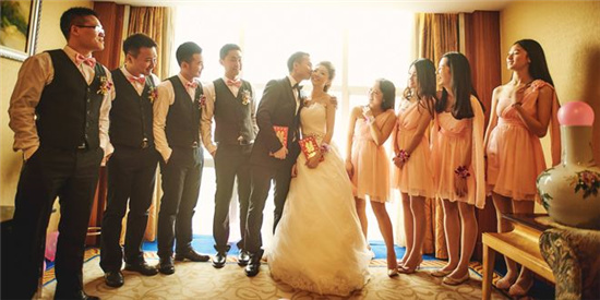3、按时到新娘家报道,随新娘准备尚缺物品(如头上的插花),有些可能还要布置场地,能见到新郎和伴郎较好。此时一定要注意多沟通,新娘已经忙晕了,可伴娘要清醒,多问问该准备的事都准备全没,喜烟、喜糖、敬酒时的假酒、撒花瓣的女宾、点炮竹的男宾、香槟台、烛台都做好没,音响试过没,主持又联系没……不要以为新人会把所有事都记住,把他们的婚礼当成自己的,从开始就进入角色,毕竟成功的婚礼是每个人都期盼的。如果有条件,一定建议新人在实地演练一遍,在他们练习时,把自己想象成跟在后面,在脑海中演练。
