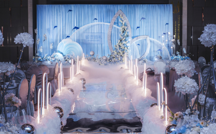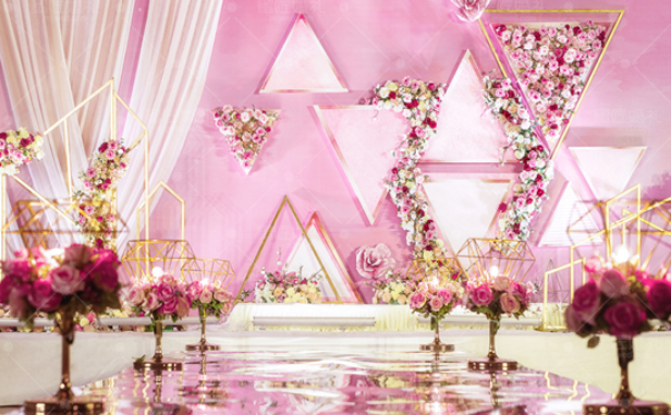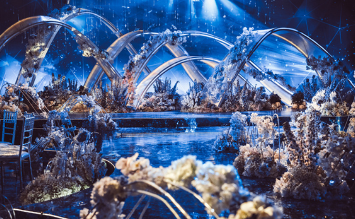 灵感源自于古风诗词“相思尽漫,挥赋百折扇”。主舞台选用深浅不一的百折扇搭配印雪白梅,在古韵十足的镂空门间错落点缀,极尽唯美又不失大气,较大程展现场景布置的层次感。迎宾处则采用了绘有桃枝的团扇搭配繁盛锦簇的桃花,尽显闺中女子的娇媚与深情。踏雪寻梅间,仿佛能看到公子摇扇的翩翩风度;折枝赏花间,又似能窥见深闺佳人的千娇百态。一正一媚间深情尽展。