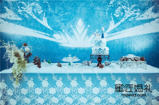冰雪奇缘的故事里追寻自由的冰雪女王爱莎,她外表冷静自持内心却热情奔放,就像冰中燃烧的火一样,这场名为冰雪奇缘的婚礼就是为了实现新人的梦想将她变成自己心中的“冰雪女王”。为切合婚礼的主题设计者使用冰蓝色为主色调,冰蓝色带有一种静逸疏离的美,宛如一弯素净的盈盈秋水自带一番孤高蕴致,再配加一些白雪的色彩纯洁圣神又不失平凡美好,让新人在属于自己的冰雪城堡中成婚,结成一场独属自己的冰雪奇缘。