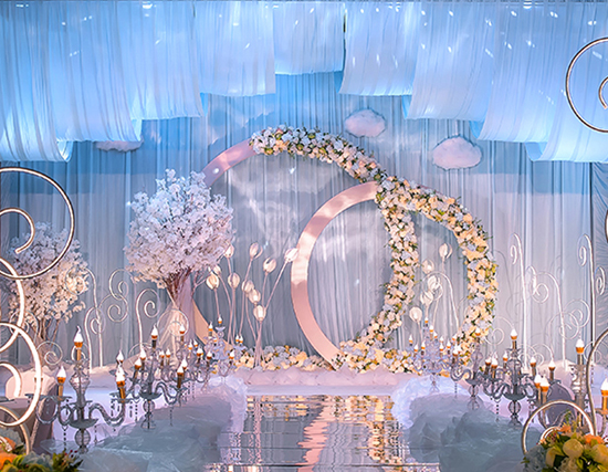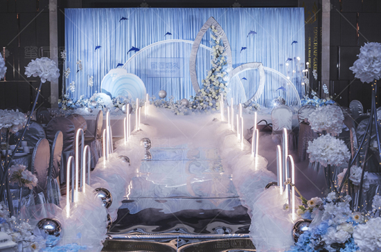 设计灵感源自“邂逅月光女神“,将灵动的“花好月圆”造型完美融入到神圣的婚礼中,谱写了一 段古典的爱恋与流行婚尚相结合的恋歌。蜜匠策划师与设计师联袂打造、秉承精益求精的工匠精神,反复讨论、推敲、现场比对测试,较终 以纯净的天空蓝作为主色调,极具感染力的3D景观设计,唯美至极的表面却透露着精致高贵的气质。