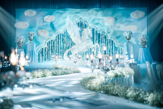 婚礼的主题色是代表天空的水蓝色,水蓝色澄净优雅,带有一种别样的美和蕴致凸显婚场的雅致情调。而在配饰的选用上设计者尊重了新人的意愿将主题背景版选为简单的云朵和鲜花流苏配上飞翔的独角兽,独角兽在传说中象征纯洁美好寄托了新人的美好祝愿,同时在婚台的两旁加上水晶烛台和满天星更加烘托出整个场景的梦幻情调,再配合灯光的使用称托使人仿若飘在云朵之上参加一场梦中的婚礼。