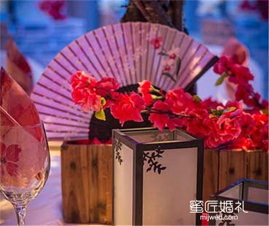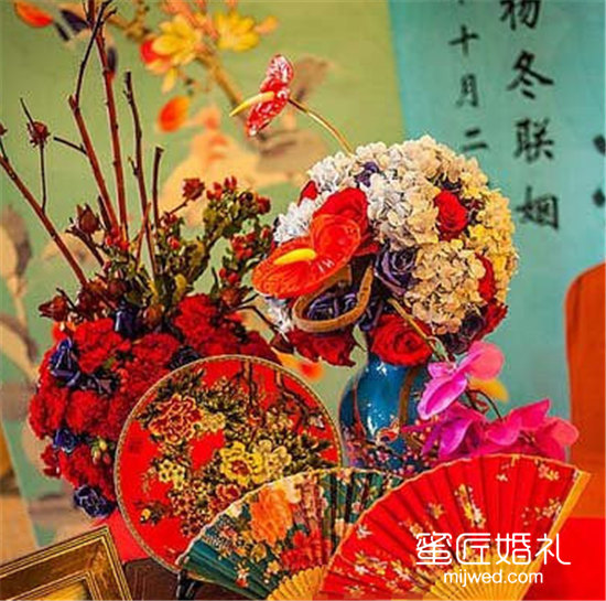 扇子是中国古老传统的一个象征,举办中式婚礼又怎能少了扇子元素,这款中式婚礼桌花就很好的将扇子融入其中。