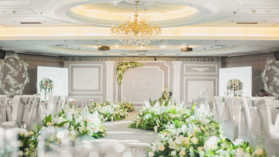 婚庆布置较关键的一步就是不管是什么形式的婚礼,鲜花是不能少的,较好的效果就是让客人感觉仿佛置身在一个盛开的花园里。除了仪式台还有餐桌上使用鲜花外,可以去苗圃租一些绿色植物,营造青葱繁茂的花园景象。