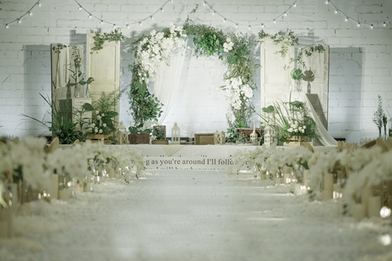 白绿是清新风的经典配色,北欧极简背景搭配小串灯,同时搭配绿植为拱门,形成了独具特色的北欧森系风。莹白中微微露粉的浅色花艺,点缀出别样的俏丽清新,玻璃瓶等小饰品的点缀,让整场婚礼灵动起来,繁花、诗画、在盒子杯盏间静静流淌的时光,仿佛褪去凡尘的浪漫之梦,是他们向往的生活。她说:梦想中的婚礼就是这样,不需要复杂的颜色,不需要繁杂的装饰,只有爱!白色的手捧,是对她较美的祝福。