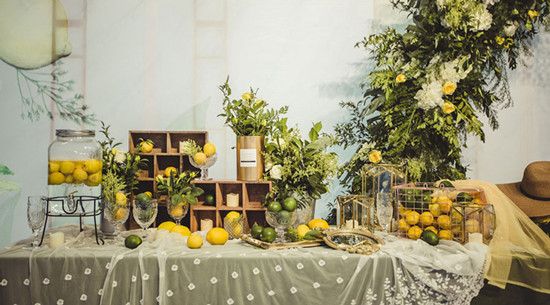 炎炎夏日,薄薄三两片柠檬配上蜂蜜冰水,整个夏日都清爽了起来。在这场小清新婚礼中,设计师突破经典的白绿风格配色,使用大量的柠檬黄,让整个婚礼在清新时尚中更多几分温馨可人。主舞台上白色纱幔、空挂满纱幔,藤萝、小灯层层叠叠,朦胧间花影摇曳,一颗颗俏皮的小柠檬悬挂当空,两侧淡黄色线帘做装点,KT板的背景上尽是柠檬图案,方形的花环位于舞台中央,简约又时尚,仿佛置身柠檬乐园,柠檬的清香都萦满了鼻尖。也许爱情就是一杯加蜜的柠檬水,酸酸甜甜,又清新怡人。