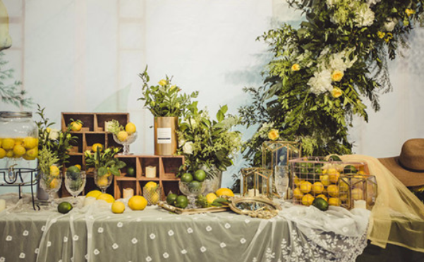 近年来水果也成为婚宴餐桌上的宠儿。水果不仅有漂亮的外形,而且比较契合环保的流行趋势。把鲜花和水果结合起来做餐桌装饰,会非常别具一格。比如像粉牡丹和青苹果的搭配就是常见的组合,其他像玫瑰和橙子、白百合和葡萄等都是不错的搭配。如果不使用水果,单纯的粉红、粉紫的鲜花,就算没有用任何的绿叶做衬托,也会给人繁花似锦的感觉,让人沉浸于粉粉的浪漫感觉。