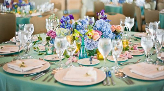 1.在布置婚宴桌时,一小盆一小盆的鲜花盆栽不再是主流,一个高脚杯的婚礼花饰瓶成为主角,既能节省婚礼资金,又能提高新人婚礼档次。透明的玻璃杯、纯净的蓝色餐巾不,都让新人的婚宴显得优雅干净。