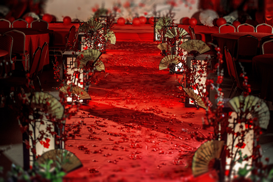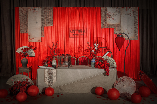 仪式通道从新娘出场区到舞台的通道上面,用喜庆的大红地毯铺台,玫瑰花瓣铺路,浪漫气一路盛开。两边红梅图案的宫灯在夜色下灯影婆娑,若隐若现的光线美感应景而生。古时小姐手中的折扇,与花艺巧妙搭配,一份诗情画意就这样在梅香中摇曳生姿。