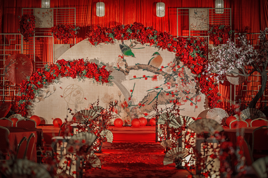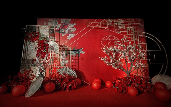 舞台精选中国红布幔为背景,顶部层次吊顶造型打造出中式大气。将喜鹊登梅元素提取出来进行创新,用精湛的工艺进行画风的丰满,并以此为基点展开整体舞台的设计。两瓣繁花缠绕,鹊喜梅枝头,半圆裹挟着这满园的春色,与舞台扇形扇子搭档的恰是圆满。别致的油纸伞和折扇,舞台右边高达三米的玉兰花树,又平添一丝俏丽。梅花,爱情的信使,谁家闺女要是赶上这梅花盛开时节,梅下轻歌曼舞,借梅传情的美事又怎少得,关于梅的爱情,总是那般的浪漫婉约。