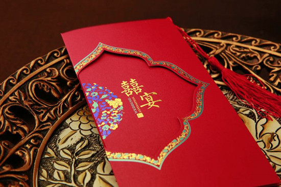 1.装饰:喜帖会用到很多装饰,比如流苏、盘扣、缎带等等。这些细节装饰需要新人仔细检查。盘扣黏贴的是否平整,会不会开胶;缎带的裁口是不是会脱丝;流苏会不会开线;粘贴的小钻是否干净,有没有胶暴露在外。