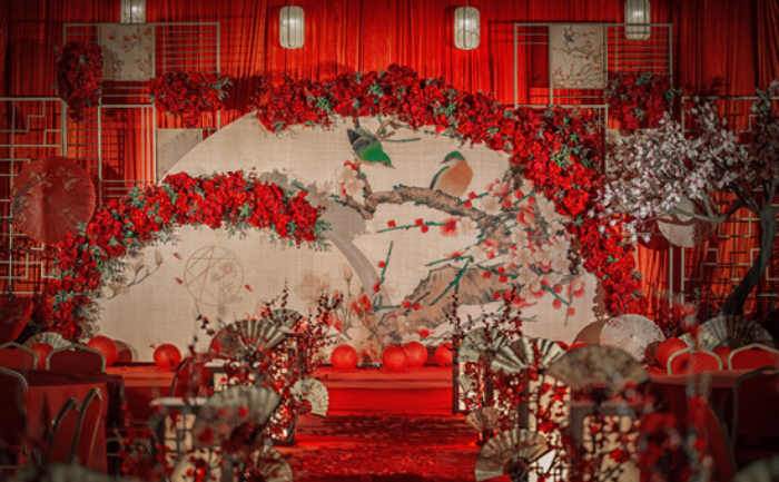 迎宾区:迎宾区是迎接来宾的地方,往往也是给来宾留下较好印象的地方,婚礼花艺的花器尤其在迎宾区可以别出心裁。不同的设计布置会有不同的效果:简洁的鲜花布置,清爽的花朵,浪漫的感觉;蓝色的迎宾区,适合童话婚礼和海洋婚礼;喜气洋洋的红色,给人热闹喜庆的感觉。然后会有个迎宾台,长方形桌子2张,上面铺红色桌布及精美台花一个;全新2 本红色嘉宾签到簿,签字笔2支。全新透明玻璃长型立式容器1-2个( 装礼金红包用的),容器下部系金色宽缎带。