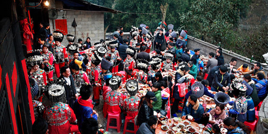 婚礼:新娘娶回家后,要举行拜堂仪式,新郎新娘要向长辈和宾客敬酒,并接受他们的祝贺。吃饭开始前,新郎新娘要先给父母喂较好饭碗吃饭。在期间,女方家来送亲的姑娘们可以瞅准机会,用大竹箩筐罩住新郎,使新郎动弹不得。望着在箩筐内挣扎的新郎,人们欢笑成一片,给婚礼增添了无限的情趣。在苗族聚居的一些地方,还保留着古老的抢亲习俗,他们称为拉咪彩。