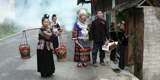 迎亲:结婚这天,男女双方都在家里宴请亲朋好友和同村寨的乡亲。新郎由几个伴郎陪同,带着礼物前去娶亲。娶亲者中要有一位经验丰富的中老年男子,娶亲者到达女方村寨时,会有一引起妇女伸出竹竿拦住去路,要与娶亲者对歌。每对完一首歌,娶亲者都要拿出礼物给这些妇女,她们才会收回竹竿让路。如此走一段,对歌一次,反复数次才能到达新娘家。这期间,还要防止新郎让妇妇们抢走。如抢走了,她们会把新郎藏起来,让娶亲者不能按时娶到新娘。到了新娘家,姑娘们还会围住新郎,将他折腾、戏弄一番,引得宾客发出阵阵哄笑。 更有甚者,有的姑娘还用锅灰把新郎的脸抹得黑不溜秋的。望着新郎的狼狈样,人们会爆发出哄堂大笑。