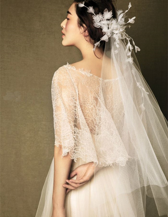 肘长式新娘头纱就是到新娘胳膊肘处那么长,这是一种非常普遍的新娘头纱,适合不是特别正式的婚礼。它可以起到凸显新娘优雅的作用,又不会盖过新娘或者婚纱的光芒。