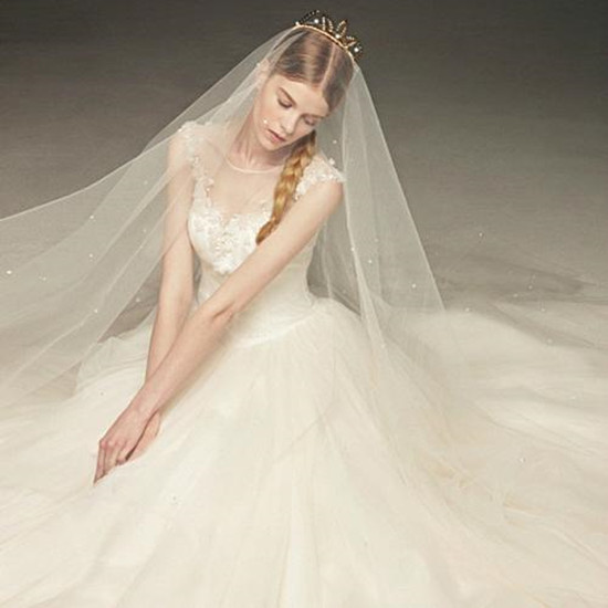 小教堂式的新娘头纱会有2.5yard的长度,从你的头部算起,顺着你的裙脱覆盖在你的婚纱上。这种头纱适合那种比较正式的婚礼,也可以作为一种增加你裙拖的方式。