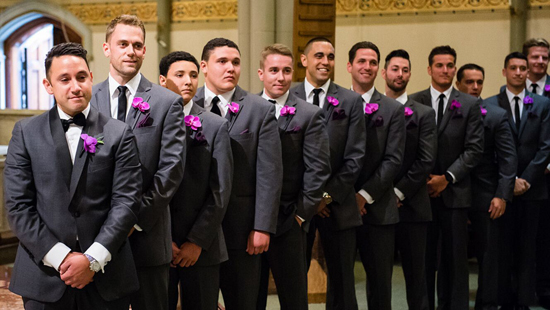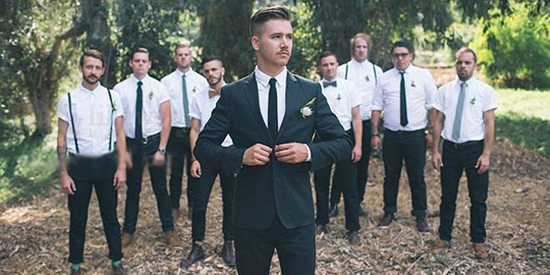 面料的选择:伴郎团选择一款时尚又低调的灰色西装统一着装会成为婚礼上一道帅气的风景线,这时候新郎也可以选择同色系的西服套装,只需要在面料上下点功夫就够了,富有光泽感或者纹理高贵的面料都是上选!