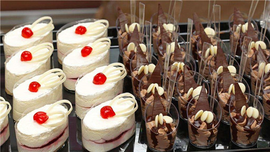 夏季自助餐婚宴餐桌上当然要有甜点,美味的水果蛋挞是不错的选择,鲜艳的颜色,水果的风味加上蛋挞的酥香一定能获得一致的好评,而且多彩的颜色卖相也非常好。