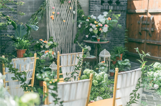 一场在历史悠久的古镇后院举行的婚礼。主舞台依院墙搭建,舞台上空横拉起几条串灯,再挂满一色纸灯笼,将主舞台打造成一场休闲派对。婚礼自然清新,小小的轻奢。根据场地的环境,加入了多肉,盆栽,原木,烛光等元素!让来宾在观看仪式,用餐时都可以感觉古镇的悠闲时光!愿你我结亲,老后亦可相伴于庭院之中享受悠悠时光。