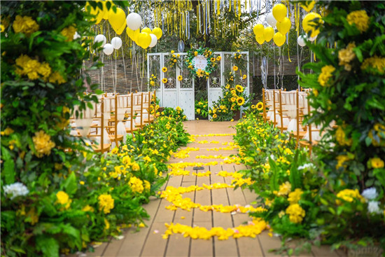 满目暖黄之间,沿着一条小道,向日葵仰头追逐阳光,慢半拍的他也迈出小跑,终于追上快步向前的她。找到被藏起的戒指,带上彼此的无名指,相视一笑便是默契。一场充满阳光,回到初心的婚礼,愿你们的爱情向日葵一样向着太阳生长,温暖每个人的心。