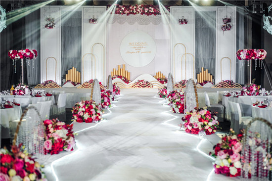 举办一场婚礼,舞台是较重要的,因此大家都会非常重视舞台的布置。舞台一般选取的位置是在酒店的正前方或者中间,那么舞台背景的颜色应该是整场婚礼的主色调,可以用各种浪漫的颜色装扮,粉色、紫色都是不错的选择。当然也可以用各种鲜花和灯光来活跃气氛,那么舞台就更容易吸引宾客了。