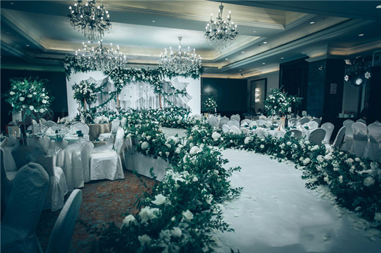 迎宾区是婚礼酒店较主要的出入口,所以迎宾区的布置很关键。迎宾区的风格要与酒店整体装饰统一,当然也要有自己的亮点,可以在迎宾区放置一些精致的小物品。比如,有造型的小卡片、或者花朵等这些都能够为宾客留下独特的印象,还能为宾客指引方向的作用。