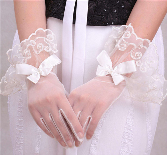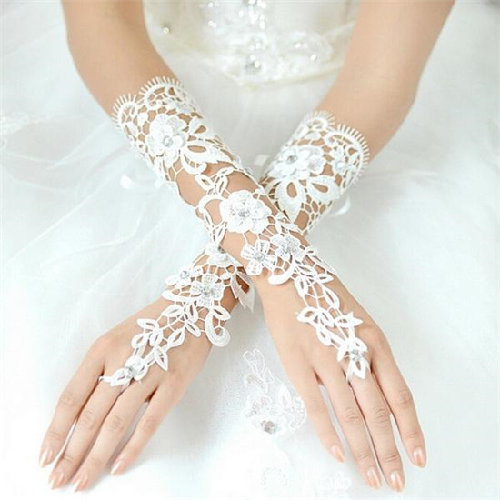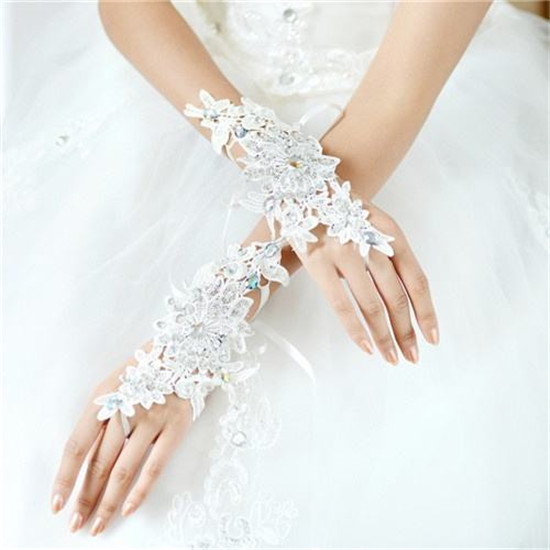 婚纱的面料主料为纱和蕾丝,或者是缎料。所以针对两种面料,搭配的手套也应该是纱蕾丝或者缎料。为了不让整体显得单一,手套可以进行修饰,但是不要太花哨,喧宾夺主往往会起 到不好的效果。但如果婚纱的款式和设计非常奢华,手套也不能落于俗套了。