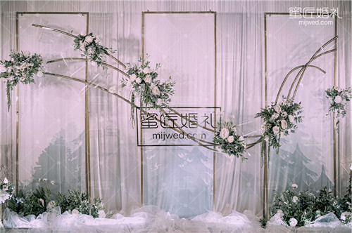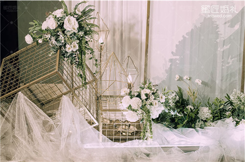 浅色系婚礼色调是较不容易出错闹笑话的一种,只要不是纯白似葬礼的那种,简单搭配上粉色、米色这样柔和的色彩后,整场婚礼都变得柔和下来了。在偏西式的婚礼上,白色的应用比重都会比较大,代表着纯洁神圣。