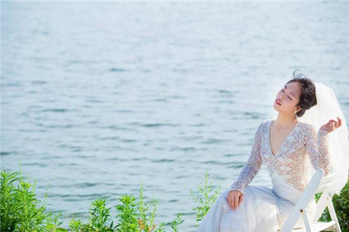 小个子新娘选头纱时一定要注意,头纱以及发型简洁即可,不要太过复杂。过于复杂的头部装饰反而会让人感觉拖沓撑不起。简洁的头饰,能够在视觉上增高之余,也不会引起头重脚轻的感觉。